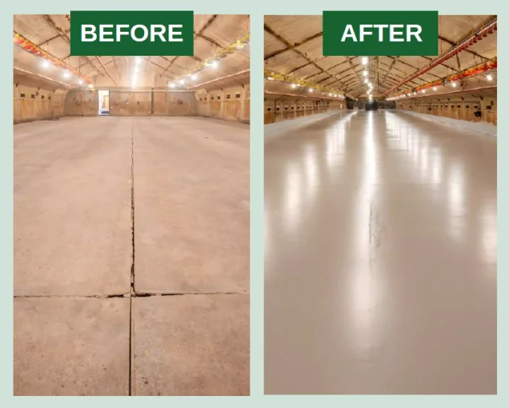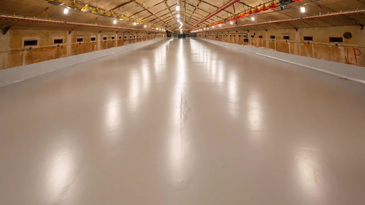 An AviSanitas flooring system is smooth, seamless, and completely sealed, free of joints and cracks. This makes the floor easier, more effective, and water-efficient to clean and disinfect compared to a concrete floor, resulting in improved feed conversion and a significant reduction in antibiotic use.